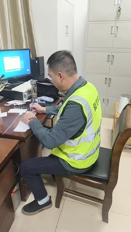 圖為:方蔡軍在朱集西記錄車輛過磅,認(rèn)真記錄每車煤炭重量數(shù)據(jù)。